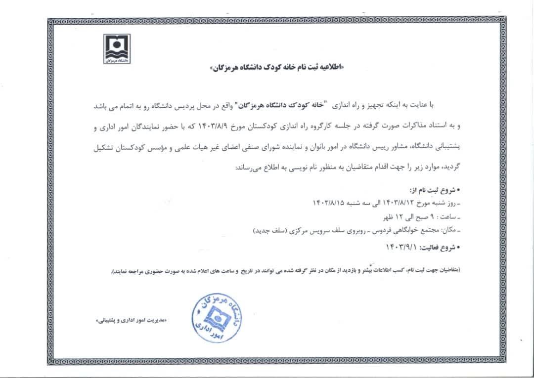 اطلاعیه ثبت نام خانه کودک دانشگاه هرمزگان