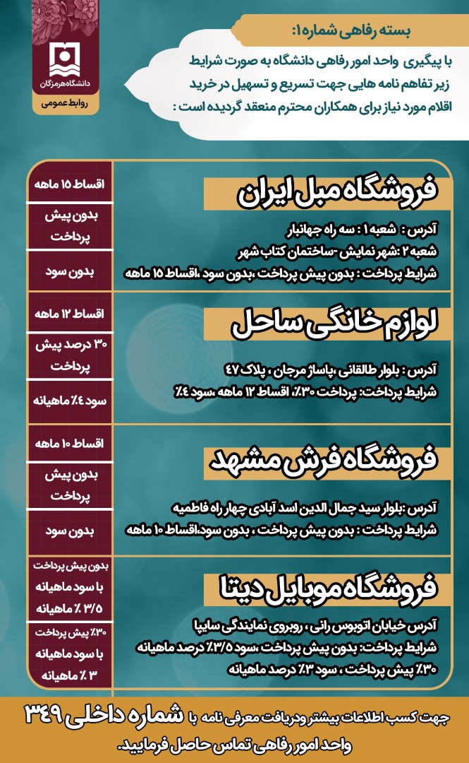 با پیگیری واحد امور رفاهی در راستای هماهنگی و افزایش همکاری جهت ارائه امکانات رفاهی و معیشیتی به خانواده بزرگ دانشگاه بصورت شرایط زیر تفاهم نامه هایی جهت تسریع و تسهیل خرید اقلام مورد نیاز برای همکاران محترم منعقد گردیده است.