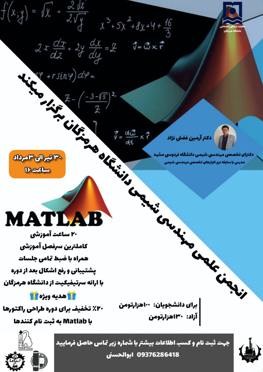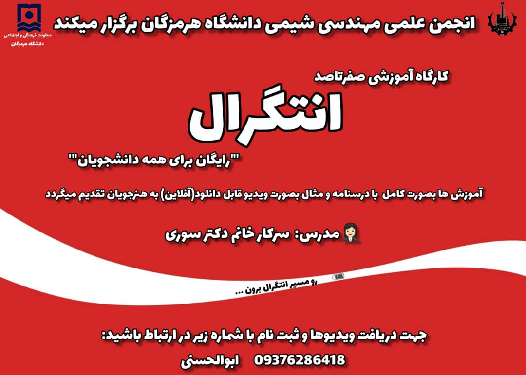 انجمن علمی مهندسی شیمی دانشگاه هرمزگان با همکاری معاونت فرهنگی اجتماعی برگزار میکند: کارگاه آموزشی صفرتاصد انتگرال
