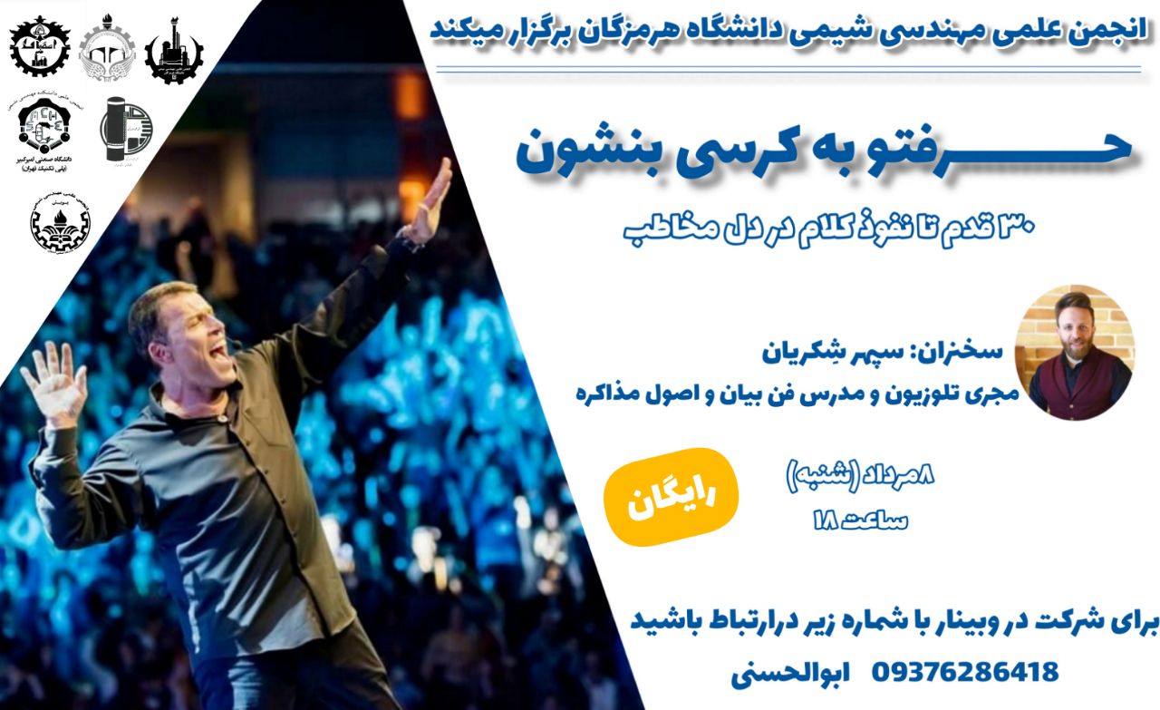 حرفتو به کُرسی بنشون سی قدم تا نفوذ کلام در دل مخاطب. توسط انجمن علمی مهندسی شیمی دانشگاه هرمزگان با همکاری انجمن‌های همکار