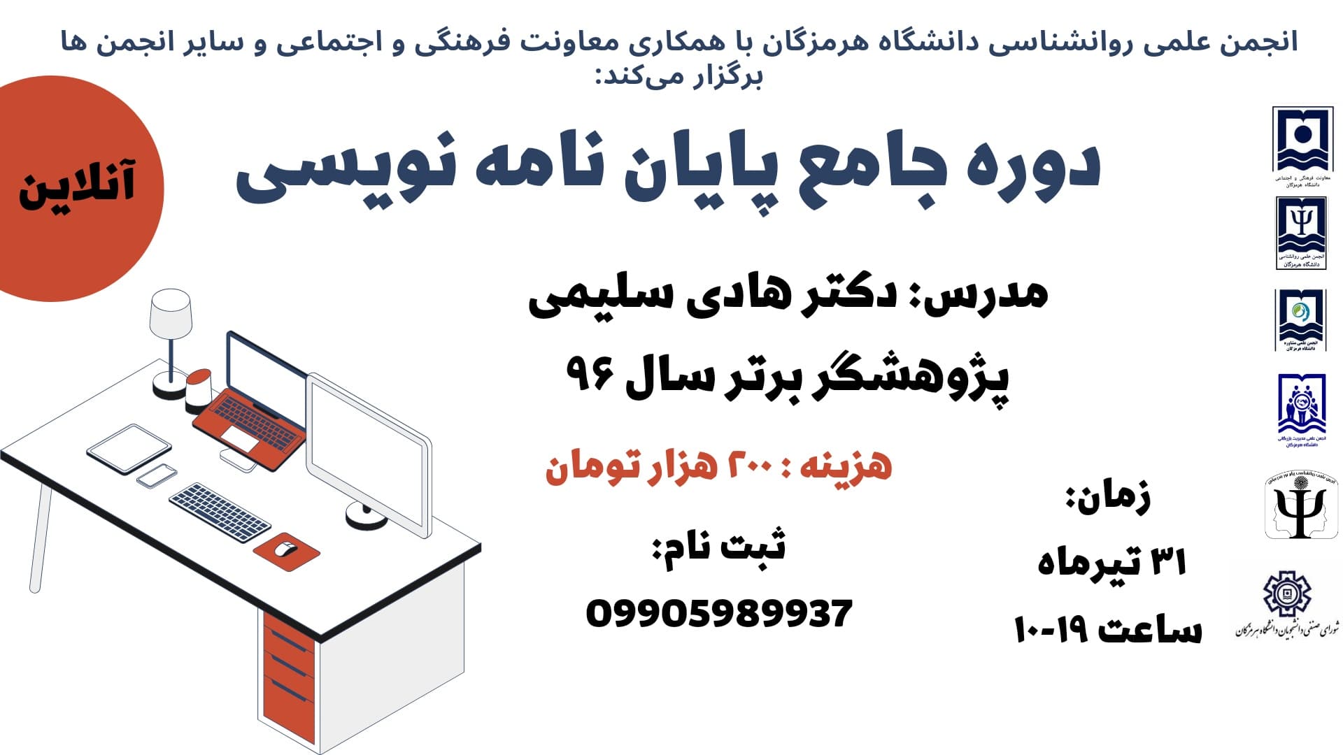 انجمن علمی روانشناسی دانشگاه هرمزگان با همکاری معاونت فرهنگی و اجتماعی و سایر انجمن‌ها برگزار می‌کند:دوره جامع پایان‌نامه نویسی
