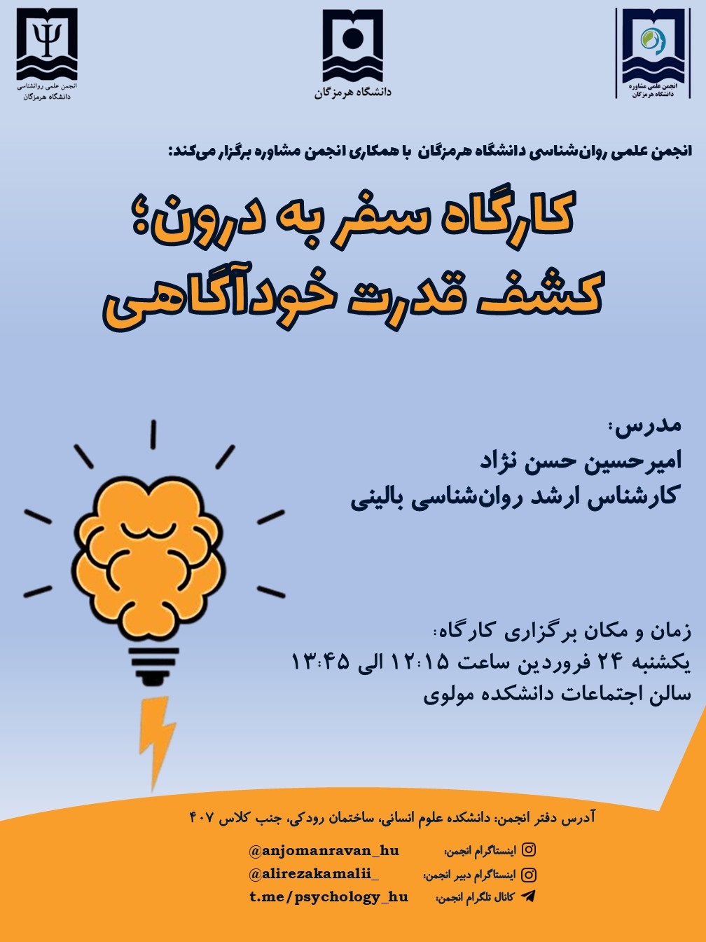انجمن علمی روان‌شناسی دانشگاه هرمزگان با همکاری انجمن‌ مشاوره‌ دانشگاه هرمزگان برگزار می‌نمایند: