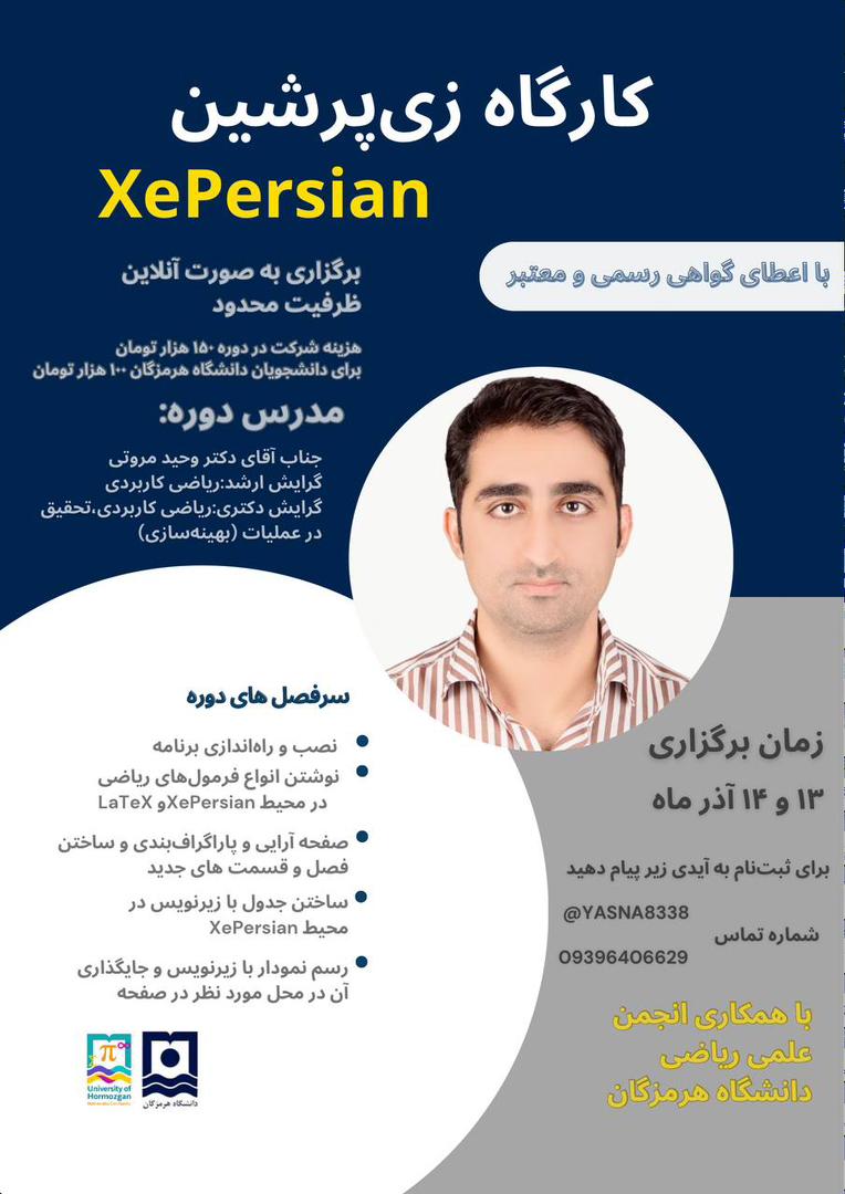 انجمن علمی ریاضی دانشگاه هرمزگان کارگاه تخصصی و آنلاین XePersian را با تدریس دکتر وحید مروتی در روزهای ۱۳ و ۱۴ آذرماه برگزار می‌کند تا مهارت نگارش علمی و فرمول‌نویسی دانشجویان را به‌صورت حرفه‌ای ارتقا دهد. این دوره با ظرفیت محدود و تخفیف ویژه برای دانشجویان هرمزگان ارائه شده و علاقه‌مندان می‌توانند از طریق راه‌های اعلام‌شده ثبت‌نام کنند.