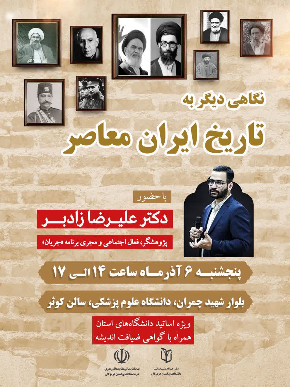 دفتر هم‌اندیشی اساتید دانشگاه‌های استان هرمزگان در راستای ارتقای سطح بینش تاریخی، تقویت نگاه تحلیلی دانشگاهیان و فراهم‌سازی بستری برای گفت‌وگوهای عالمانه، نشست «ضیافت اندیشه اساتید» را با عنوان «نگاهی دیگر به تاریخ ایران معاصر» برگزار می‌کند. این برنامه با حضور جناب آقای دکتر علیرضا زادبر، پژوهشگر و استاد برجسته حوزه تاریخ معاصر، برگزار خواهد شد.