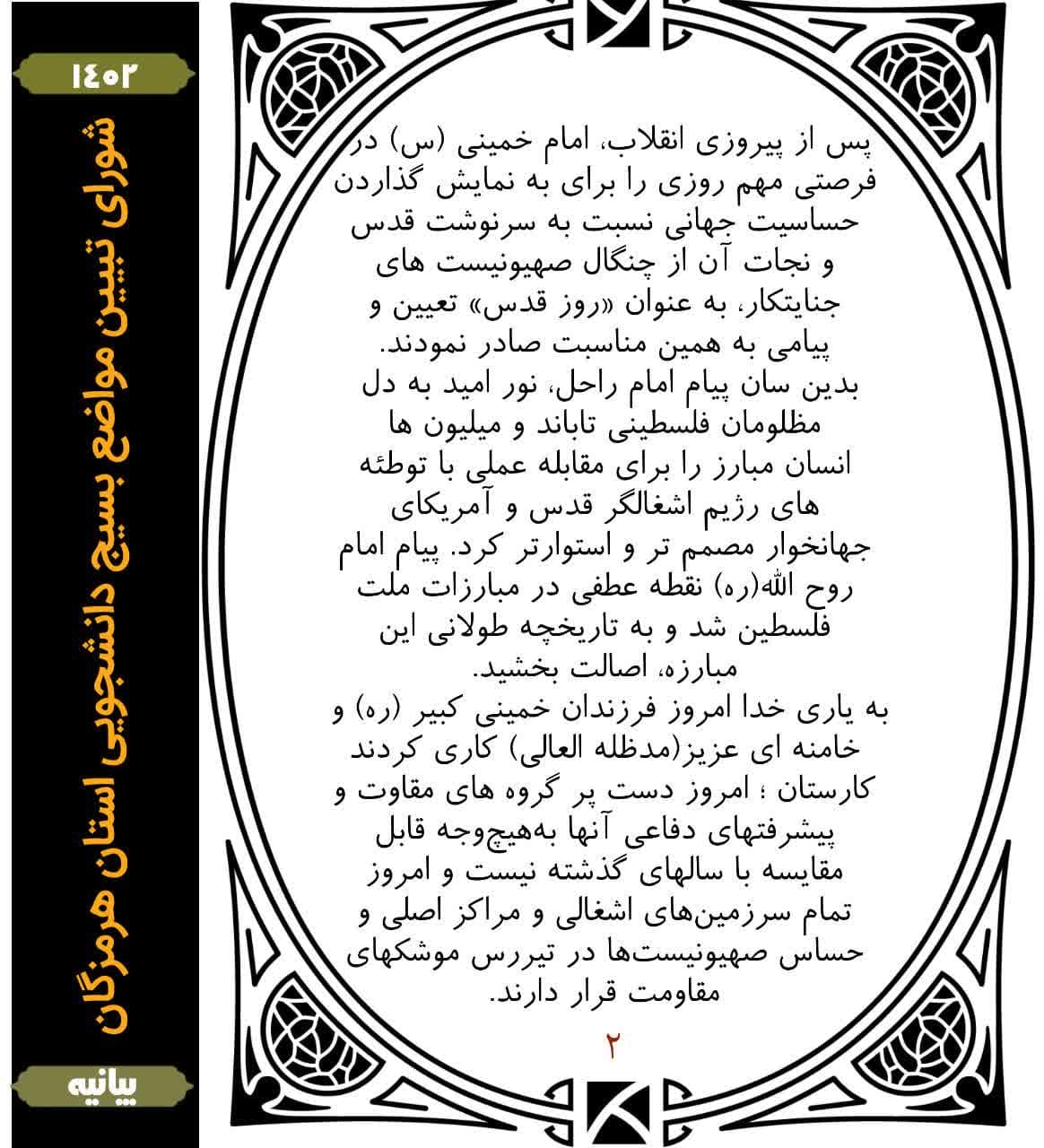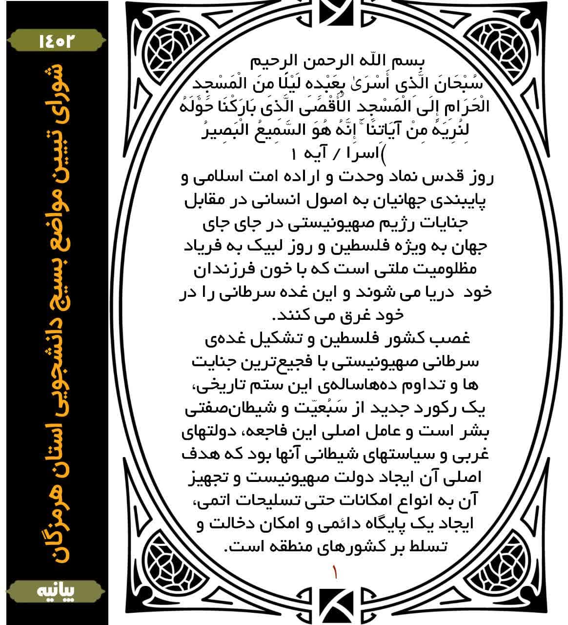 بمناسبت فرارسیدن روز جهانی قدس شورای تبیین مواضع بسیج دانشجویی استان هرمزگان بیانیه ای صادر کرد.