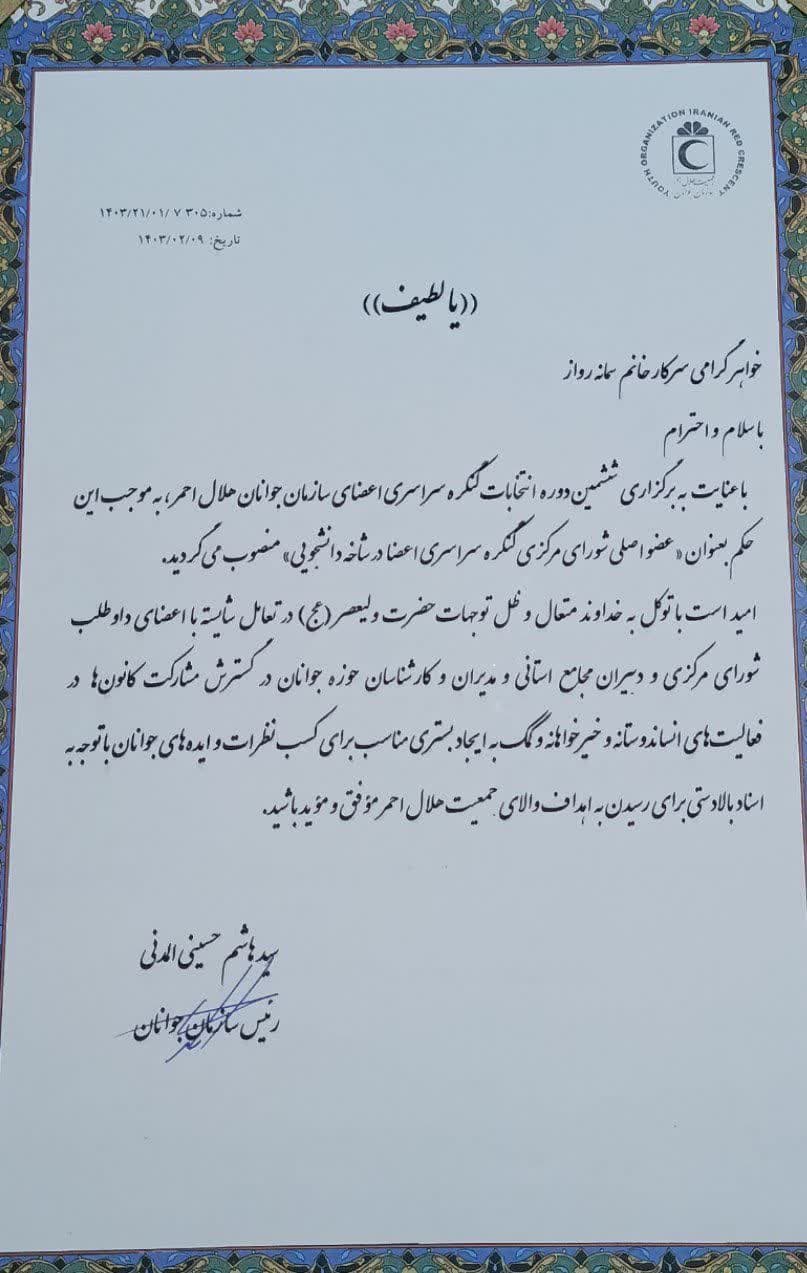 و عضویت ایشان در  شورای مرکزی  دانشجویی  سازمان جوانان هلال احمر کشور