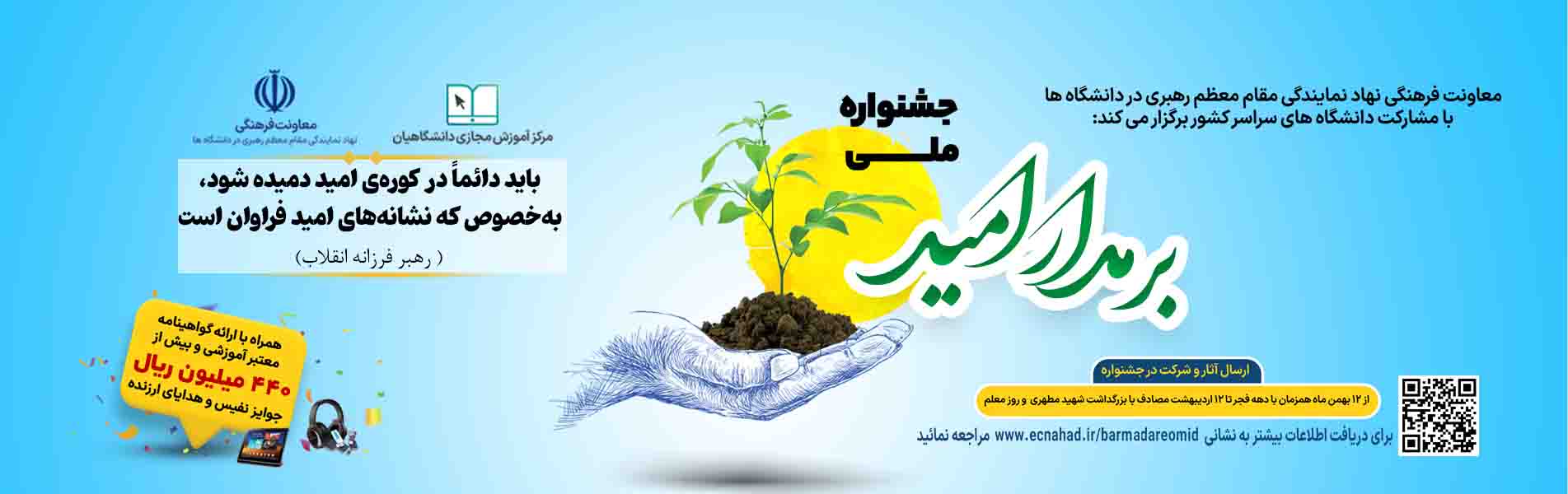 جشنواره فرهنگي- آموزشي بر مدار امید از 12 بهمن ماه 1401 لغایت 12 اردیبهشت ماه 1402 با هدف معرفی دستاوردهای انقلاب اسلامی در دو بخش "آموزش مجازی و نشستهاي تعاملي" و "تولید محتوای آموزشی - رسانه ای" در حال برگزاری است. مخاطبان اصلي این جشنواره، خانواده بزرگ دانشگاهيان به ویژه دانشجویان، استادان و کارکنان دانشگاههای سراسر کشور هستند. علاقمندان میتوانند جهت کسب اطلاعات بیشتر و شرکت در این طرح ملی به سامانه آموزش مجازی دانشگاهیان به نشانی https://ecnahad.ir/barmadareomid مراجعه نمایند.
