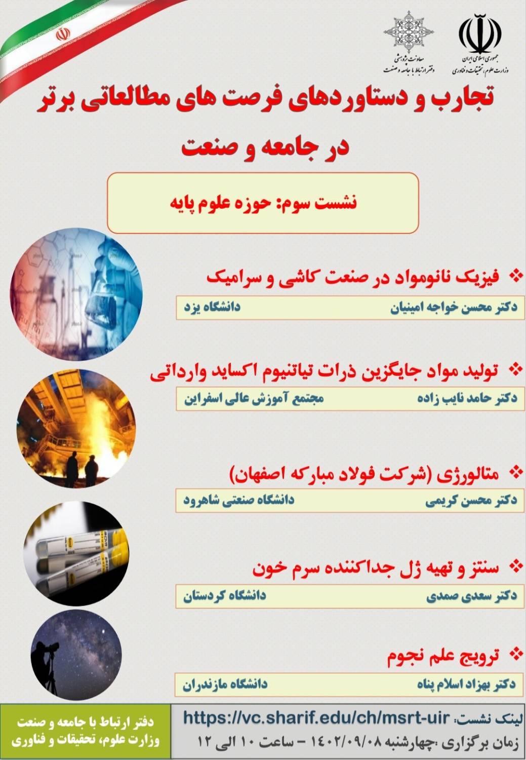 سلسله نشست های : تجارب و دستاوردهای فرصتهای مطالعاتی برتر در جامعه و صنعت، نشست سوم با موضوع : حوزه علوم پایه