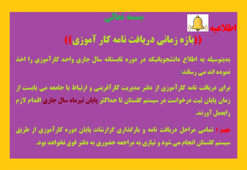 برای دریافت نامه کارآموزی از دفتر مدیریت کارآفرینی و ارتباط با جامعه می بایست از زمان پایان ثبت درخواست در سیستم گلستان تا حداکثر پایان تیرماه سال جاری اقدام لازم رابعمل آورند.