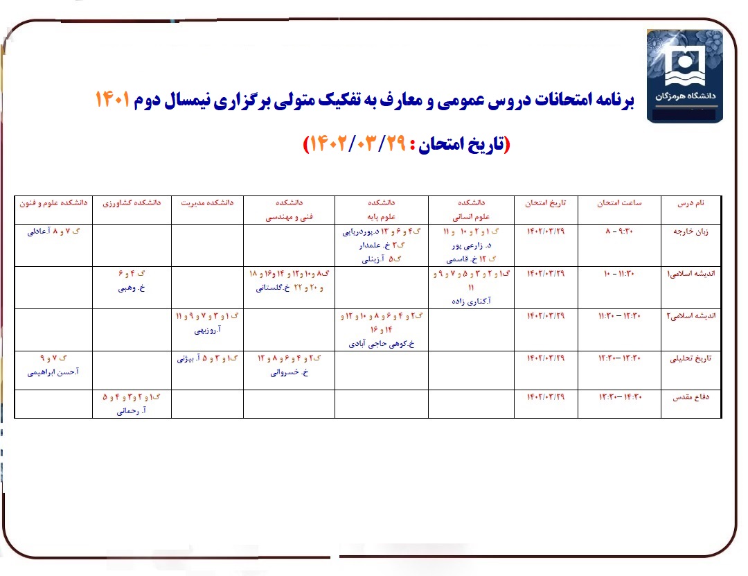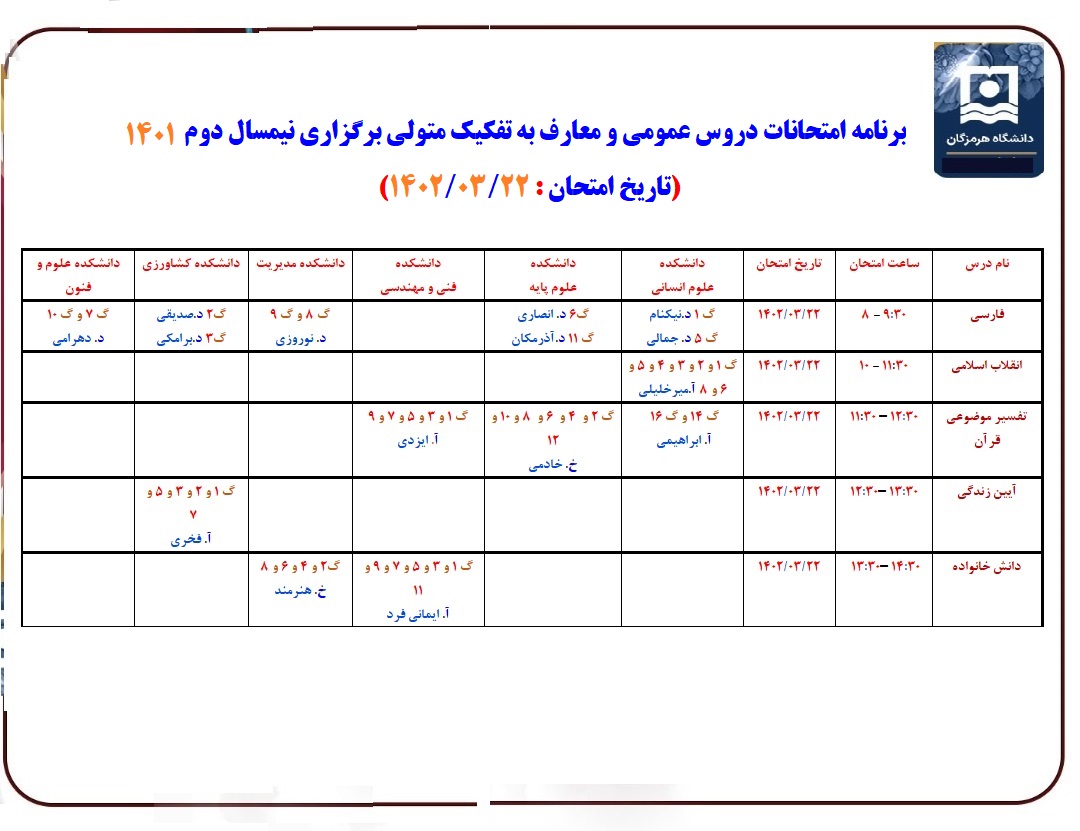 برنامه امتحانات دروس عمومی و معارف به تفکیک برگزاری نیمسال دوم 1402-1401(تاریخ امتحانات 03/22 و 1402/03/29)