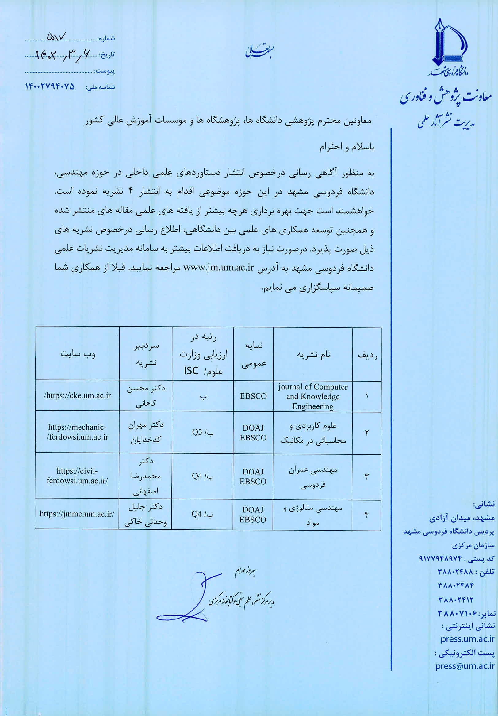 نشریات جدید در حوزه علوم مهندسی-دانشگاه فردوسی مشهد