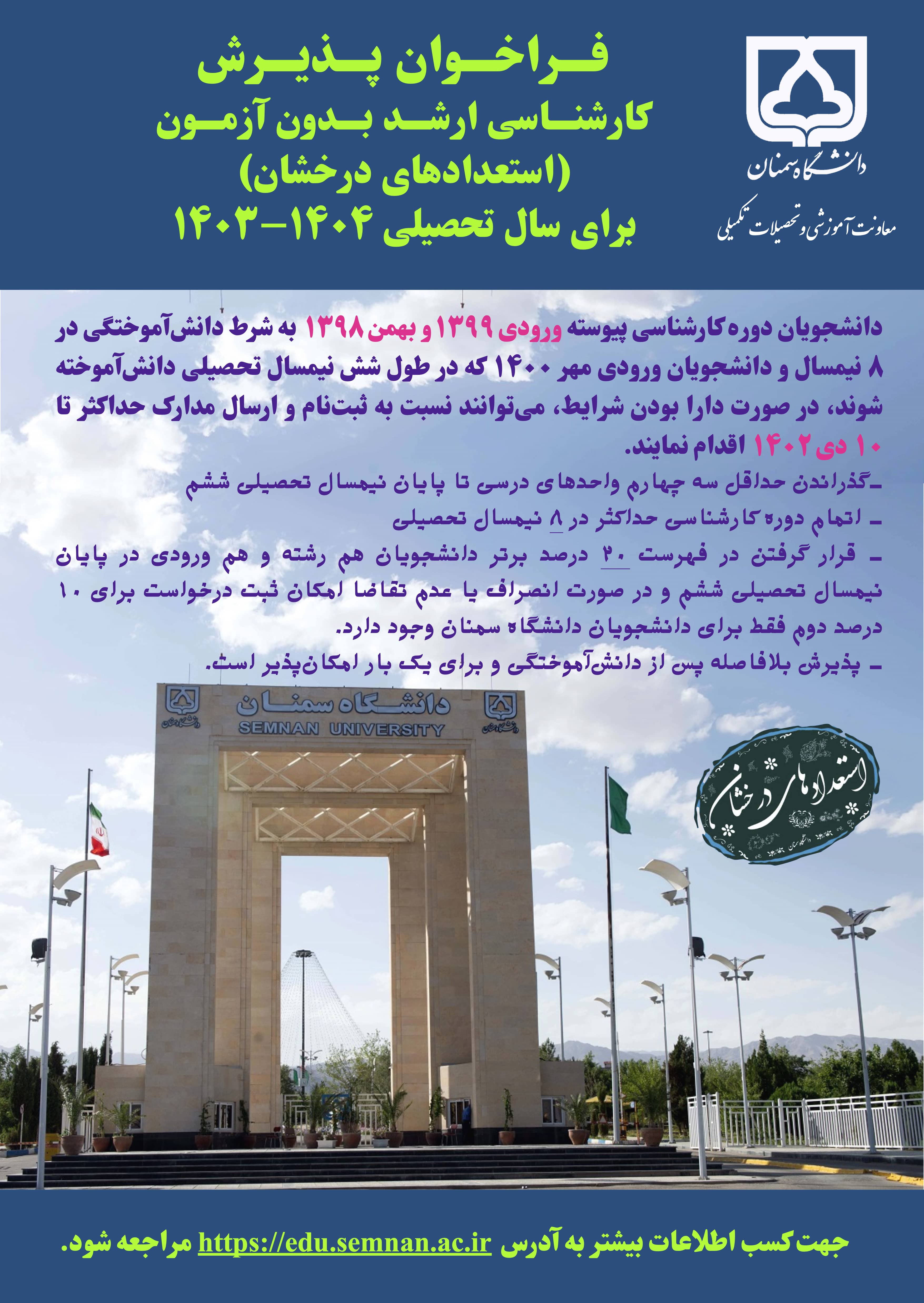 پذیرش بدون آزمون استعدادهای درخشان مقطع کارشناسی ارشد سال تحصیلی 04-1403- دانشگاه سمنان