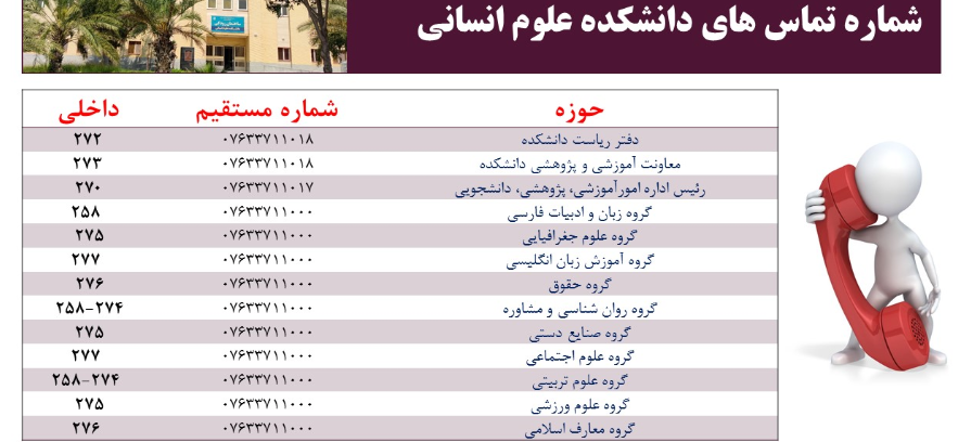 شماره تماس های بخش های مختلف دانشکده علوم انسانی و شماره تماس های ضروری
