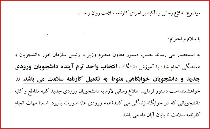 الزام تکمیل فرم کارنامه سلامت دانشجویان جدید و متقاضیان خوابگاه