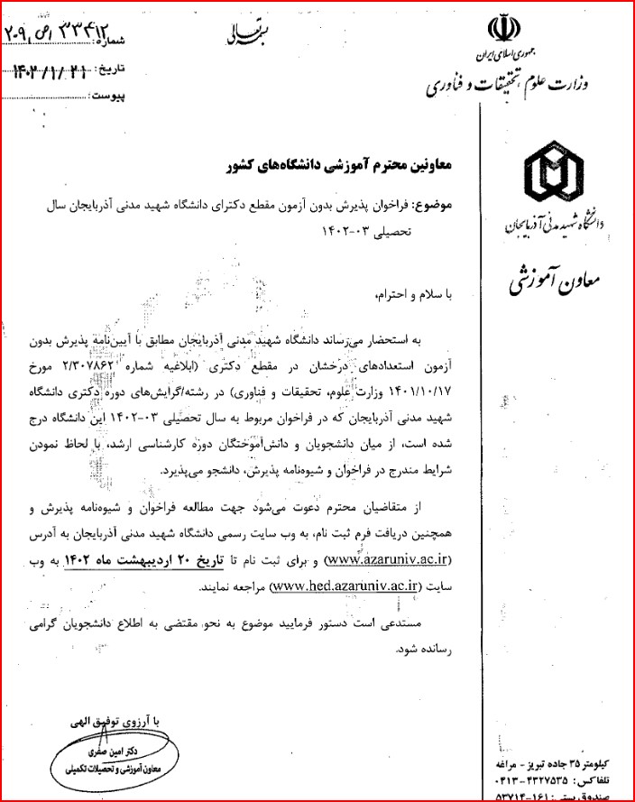 فراخوان جذب استعداد های درخشان دانشگاه شهید مدنی