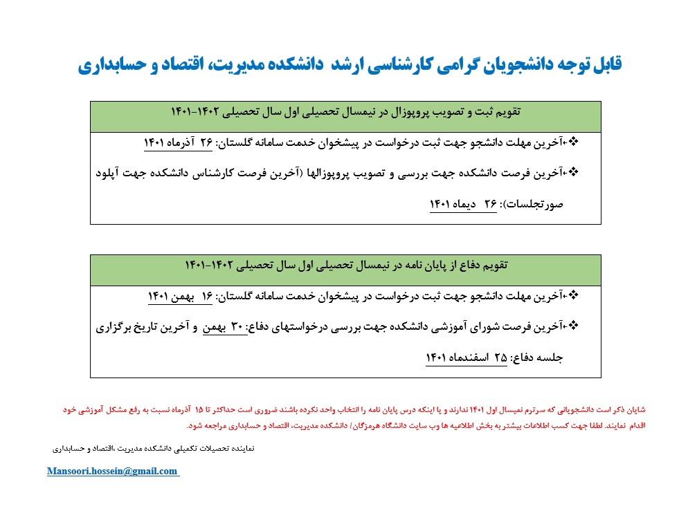 تقویم ثبت و تصویب پروپوزال و دفاع در نیمسال تحصیلی اول سال تحصیلی 1402-1401