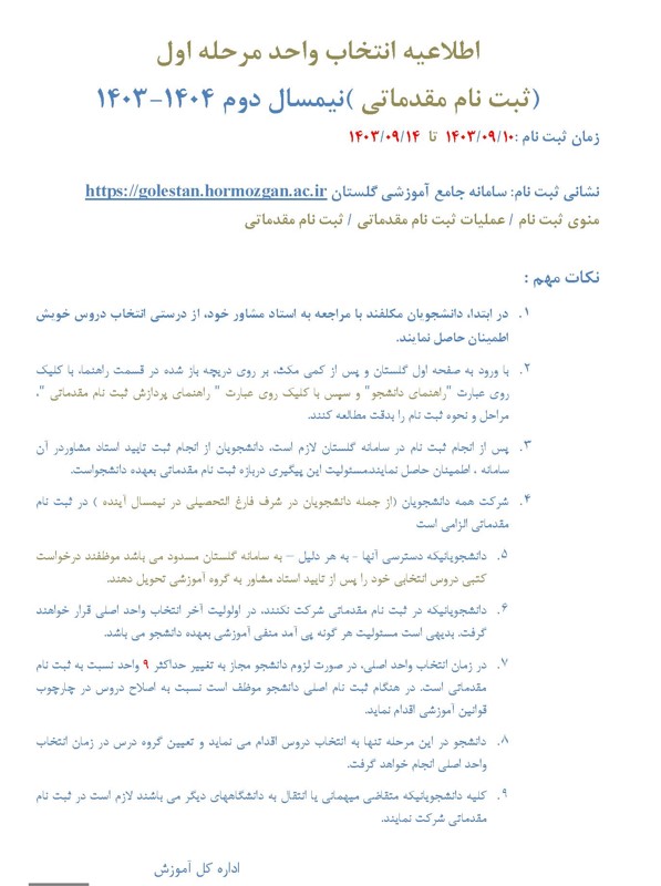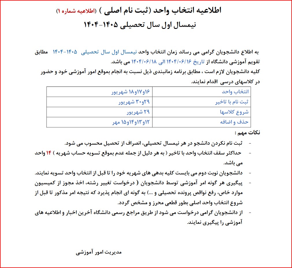 اطلاعیه انتخاب واحد نیمسال اول 404-405