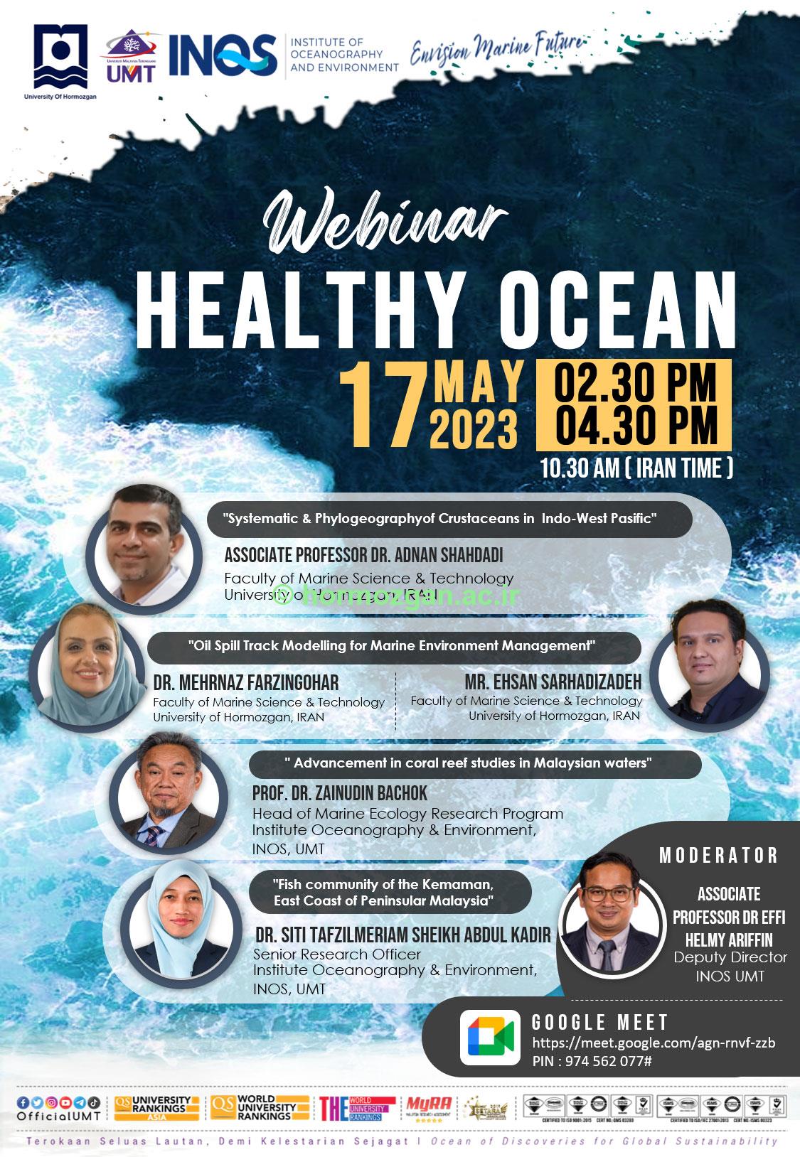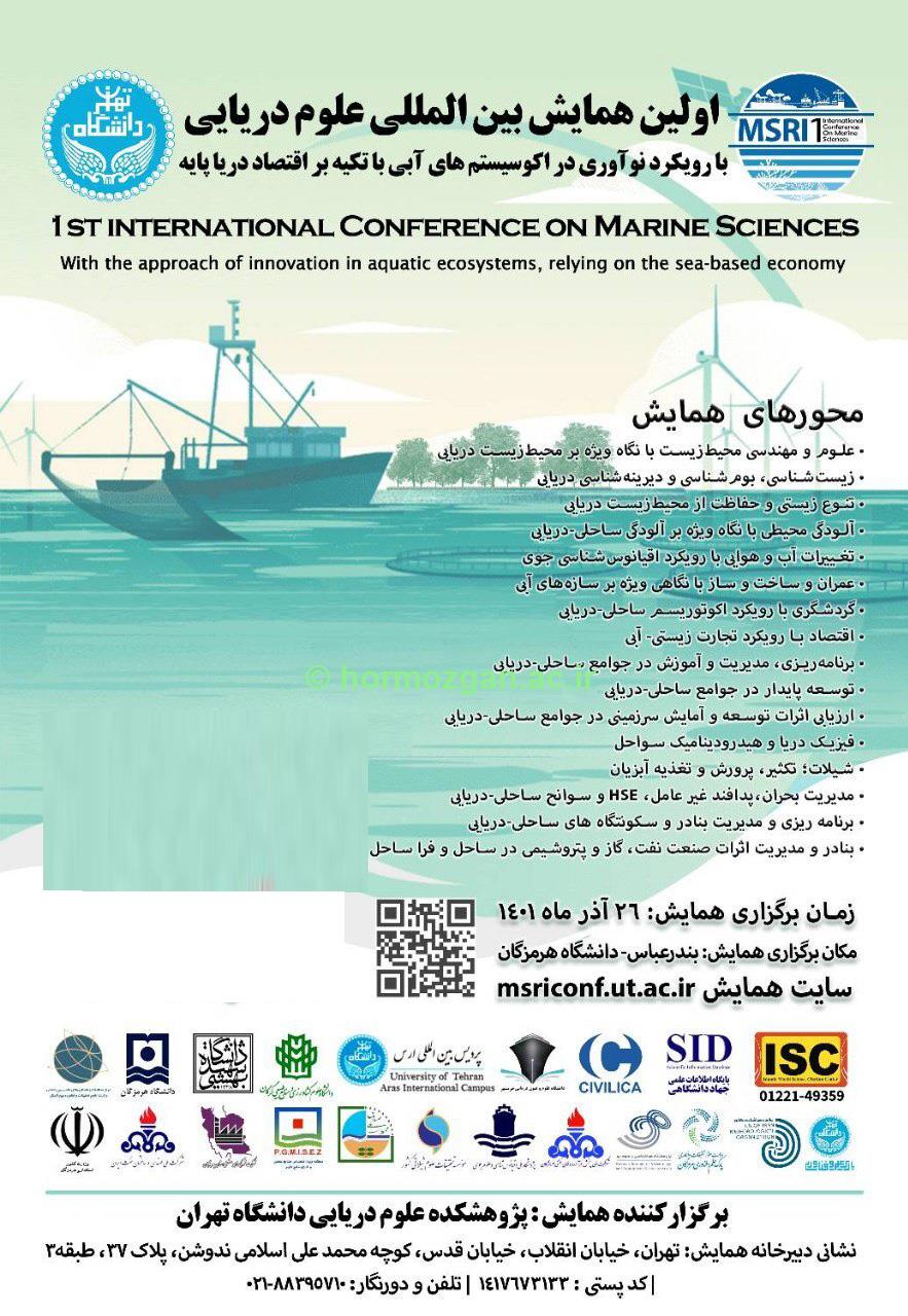 برای رشته های  زیست شناسی، فیزیک، شیمی و سایر رشته های مرتبط با علوم محیطی (Physics, Chemistry, Biology and Environmental Science) لین همایش بین المللی علوم دریایی با رویکرد نوآوری در اکوسیستم های آبی با تکیه بر اقتصاد دریا پایه نخستین رویداد علمی مشترک دانشگاه هرمزگان و دانشگاه UMT مالزی با همراهی علمی سرکارخانم دکتر مهرناز فرزین‌گهر و جناب آقای دکتر عدنان شهدادی (اعضای هیات علمی دانشکده علوم و فنون دریایی دانشگاه) کارگاه آموزشی برگزاری دوره مهارت افزایی اصول علمی و دستورالعمل های  اخلاقی کار با آبزیان آزمایشگاهی شست تخصصی صید غیرمجاز نشصت تخصصی صید غیرمجاز زمان: سه شنبه 9 خرداد ساعت:13-11:30 ثبت نام در سامانه vchu.hormozgan.ac.ir برگزاری کارگاه آموزشی کاربردهای نرم افزار odv در علوم اقیانوسی نخستین کنفرانس بین المللی اقتصاد دریا پایه یازدهمین کنفرانس ماهی شناسی ایران به میزبانی دانشگاه هرمزگان