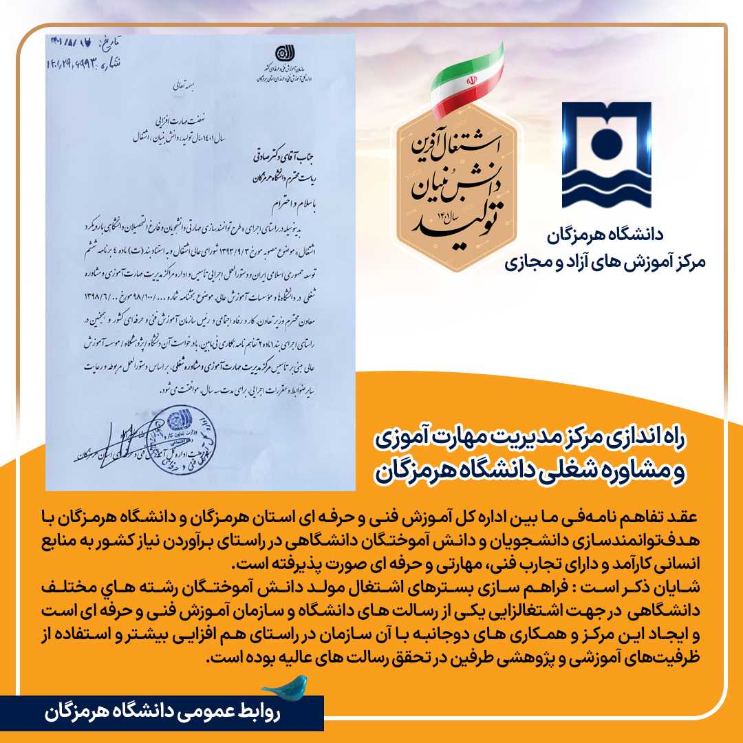 دریافت مجوز تاسیس مرکز مدیریت مهارت آموزی و مشاوره شغلی دانشگاه هرمزگان