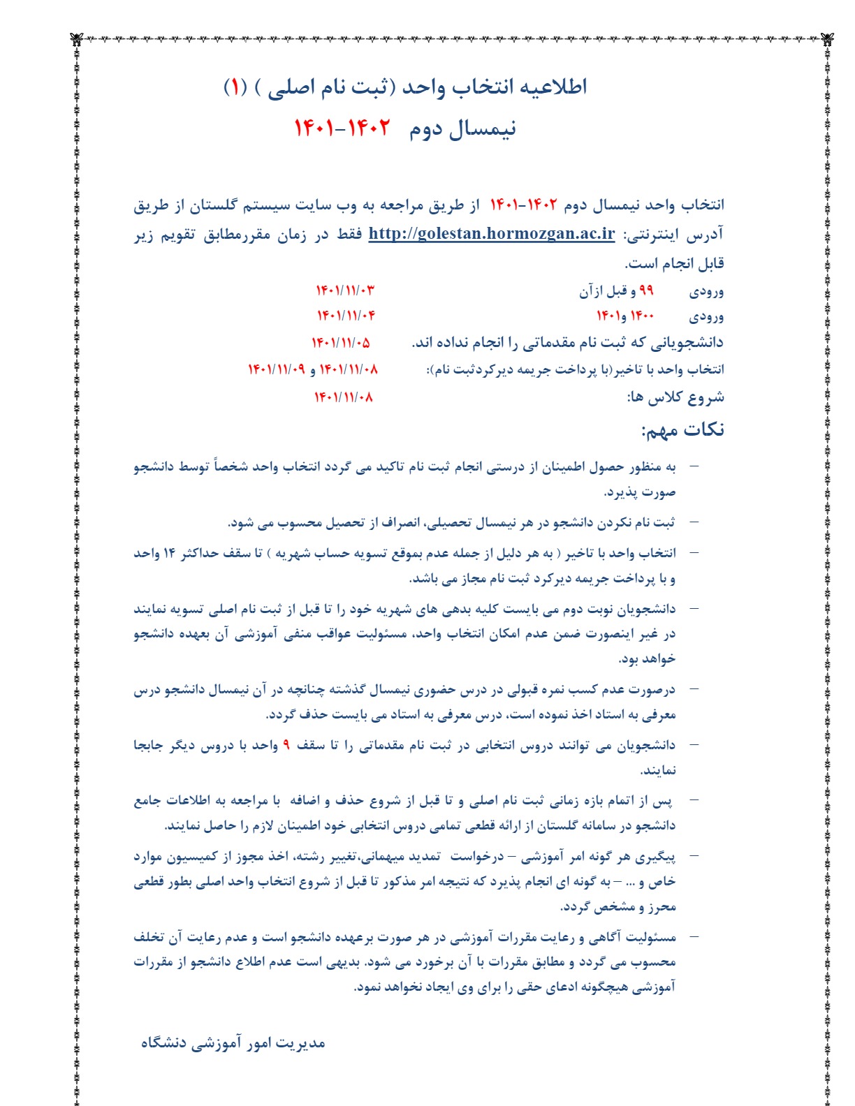 اطلاعیه انتخاب واحد(ثبت نام اصلی) نیمسال دوم 1402-1401