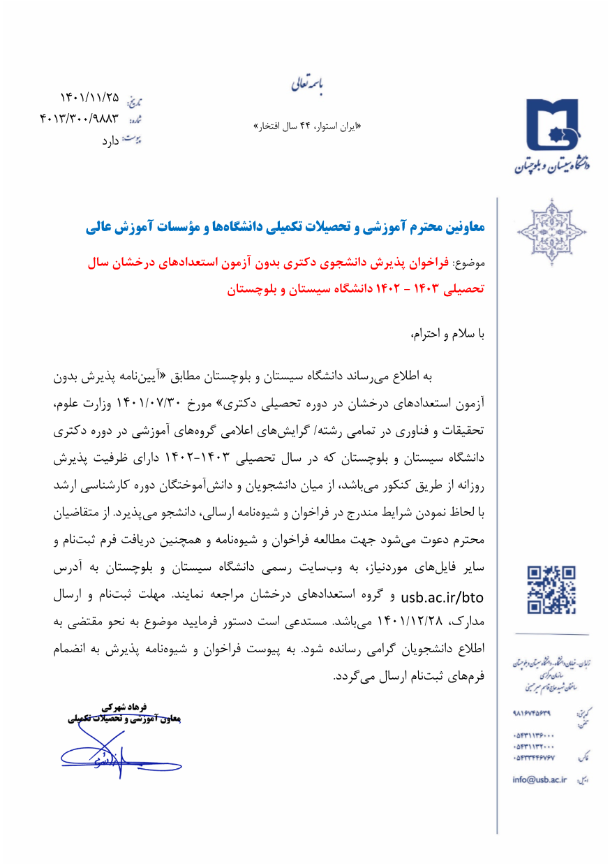 فراخوان پذیرش دانشجو بدون آزمون استعدادهای درخشان در دوره تحصیلی دکتری