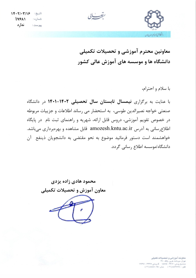 اطلاعیه ترم تابستان دانشگاه خواجه نصیر