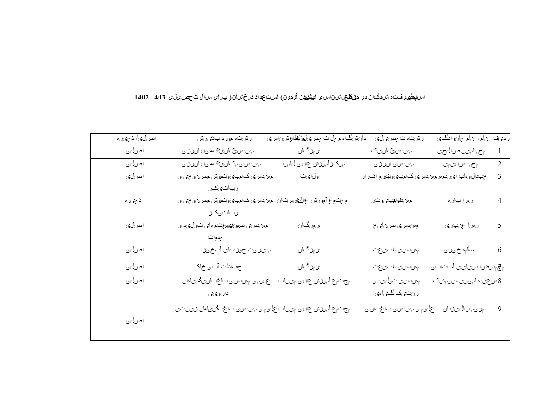 احتراما بدینوسیله اسامی پذیرفته شدگان مقطع کارشناسی ارشد بدون آزمون(استعداد درخشان) برای سال تحصیلی 403-1402 طبق جدول پیوست اعلام می گردد.