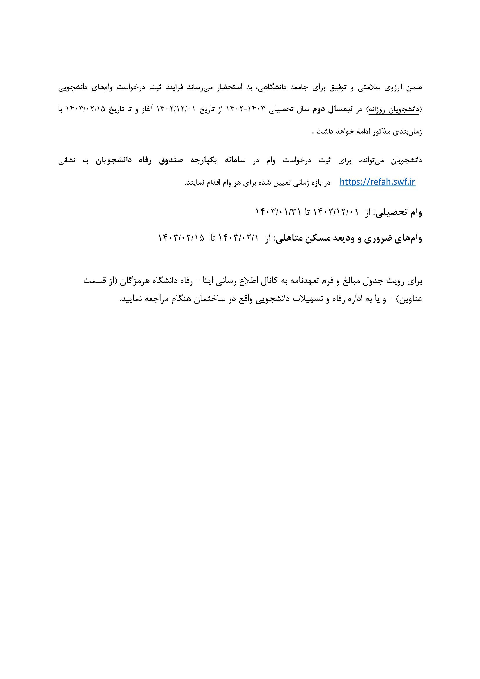 فرآیند درخواست وام دانشجویی دانشجویان روزانه در نیمسال دوم سال تحصیلی 1403-1402