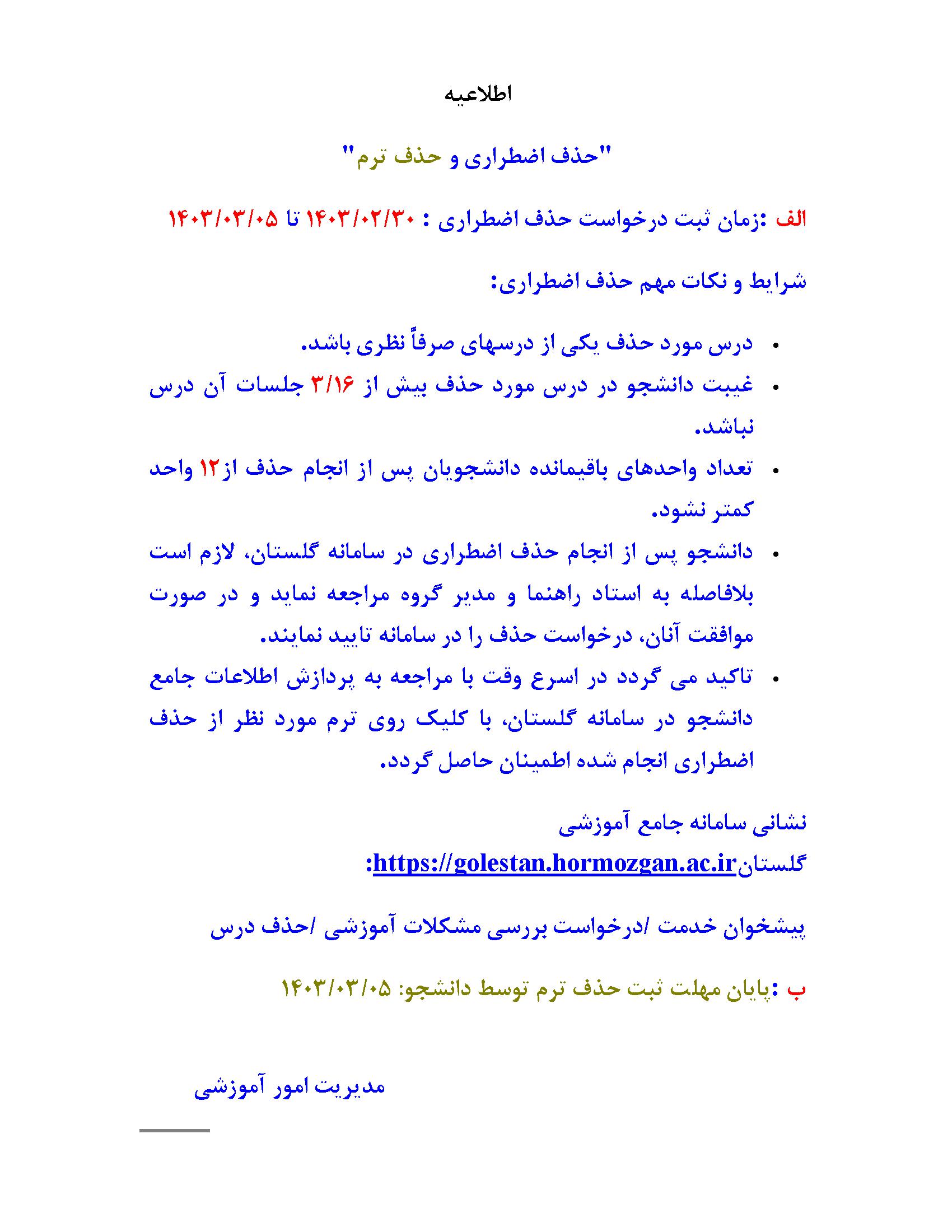 اطلاعیه "حذف اضطراری(حذف تک درس) و حذف ترم"