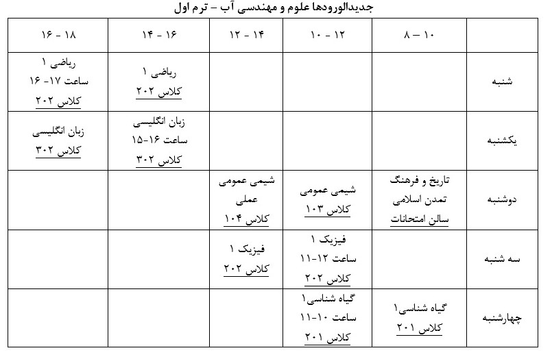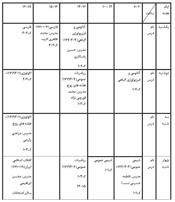 (راهنمای محل کلاس ها: کلاس های 101، 102، 103 و 104 واقع در طبقه همکف دانشکده کشاورزی، کلاس های 201، 202 و 203 واقع در طبقه اول دانشکده کشاورزی و کلاس های 301، 302، 303 و کارگاه کامپیوتر واقع در دانشکده مهندسی - ساختمان حاسب هرمزی می باشد).